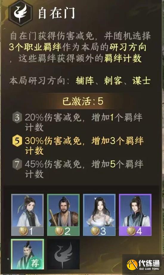 3.自在门的强度在于叶问舟师兄刷出来之后,比如有此时可以通过上三自在+一刺客+一谋士+一辅阵构成拼多多阵容(具体看本场专研的是哪三项)有一把一星师兄+回元+刺客打出了不俗的伤害就是启动慢了点。
