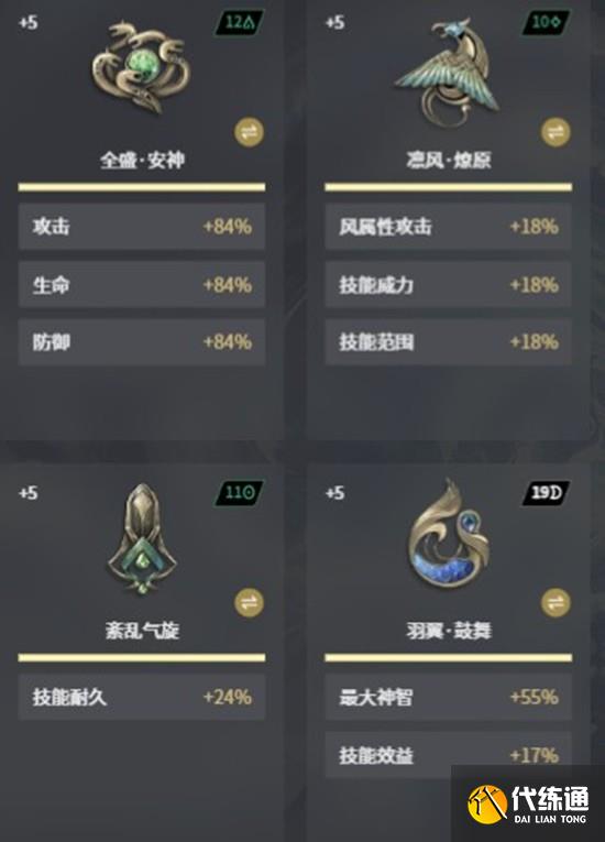 在二重螺旋中,达芙涅的核心魔之楔搭配建议选择全盛安神,提供84%攻击力、84%防御力以及84%生命值加成,全面提升生存与输出能力。高生命与防御让她在近身作战时更耐打,稳定站场输出。另一必备魔之楔为凛风燎原,提供18%风属性攻击、18%技能威力与18%技能范围加成,完美契合其风系范围输出定位。使用突击枪时,风属性攻击与技能威力叠加,进一步强化单体爆发能力。