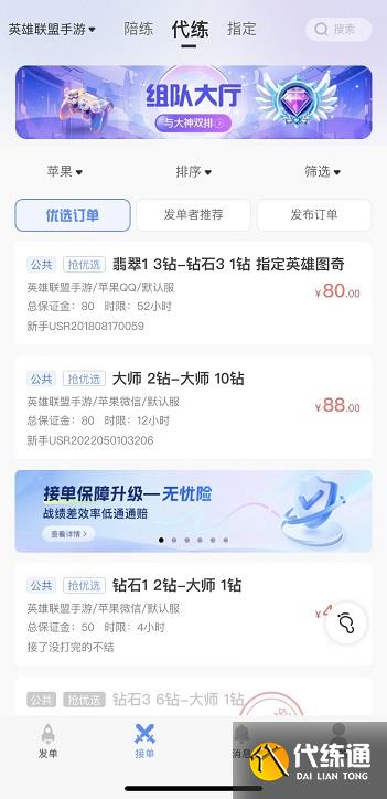 再说说平台接单,这也是我现在主要的接单方式,其中用得最顺手的还是代练通。肯定有兄弟要问:“平台价格是不是比私单低啊?” 实话实说,确实是!因为平台价格透明,所有订单价格都明码标价,想漫天要价根本不可能,比如钻石上大师,平台价基本固定在三百左右,比私单能少五十到一百。但别着急否定,平台的优势是私单比不了的——首先就是订单多,不用你到处发广告,打开代练通APP,订单大厅里的单子多到划不完,从青铜到王者,从刷胜率到拿牌子,啥类型的都有,根本不愁没单打。