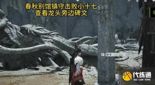 击败小十七后,战斗结束不要立刻离开,在他附近找到一块石碑并进行调查交互。系统提示追溯完成后,碎纹雕弓的完整背景故事就会被收录,一段尘封的历史就此揭开。