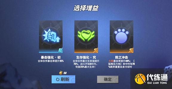 完成一次挑战即可在三个增益buff选一个,分数达到关卡上限90%,可以选两个。