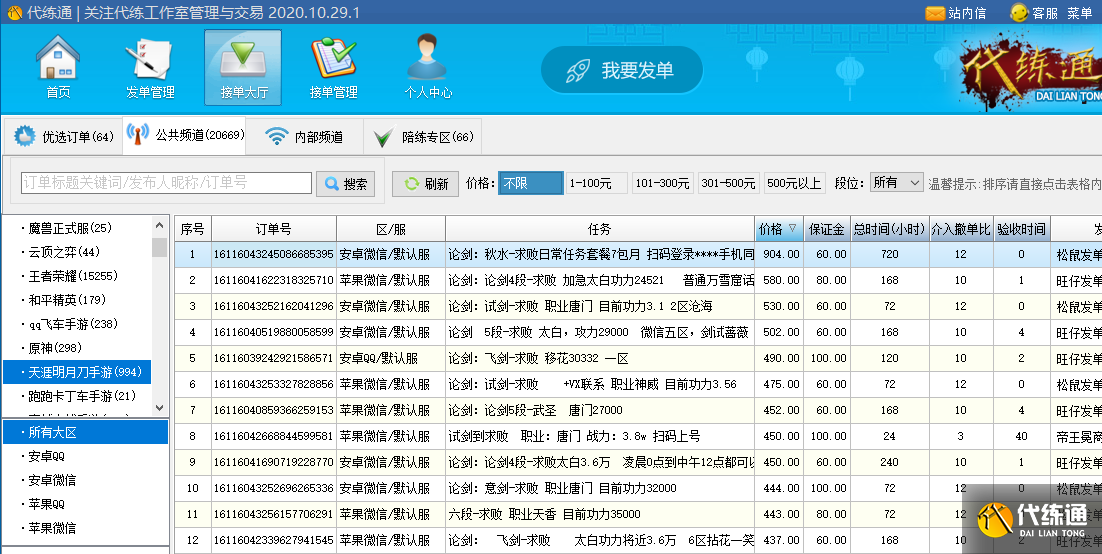 但是这些都是建立在有单的基础下,如果去私下代练,没有信誉一般都是很少人会找你代练的。想要做到真正赚钱的话还是推荐直接去代练通看看,做为代练的龙头老大,里面的信誉交易安全机制都是做的非常好的,单子量每天都会更新上百至上千,选择自己合适的去打就好,做到真正的秒接秒上。