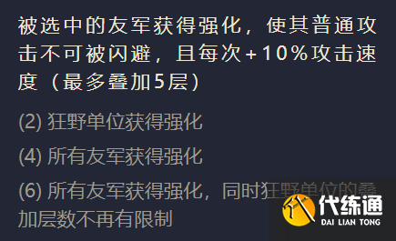 二狂野效果:在战斗开始的时候随机选中友军强化,被强化过的友军普攻敌人无法闪避并且每天攻击增加10%攻击速度。(如下图所示)