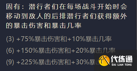 当同时拥有三个潜行者、六个潜行者、九个潜行者的时候羁绊效果分别为:额外的增加75%暴击伤害与10%暴击几率,额外的增加150%暴击伤害与20%暴击几率,额外的增加225%次暴击伤害与30%暴击几率。(如下图所示)