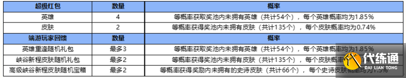 3、 超级红包,总奖励为4个英雄,2个皮肤,仅获取顺序不同;
