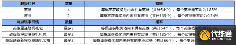 3、 超级红包,总奖励为4个英雄,2个皮肤,仅获取顺序不同;