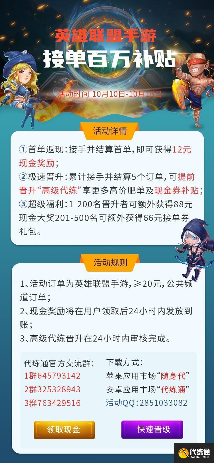 现在国内最大的一家代练平台“代练通”,作为第三方代练平台,安全担保拒绝骗打行为,给代练们提供更好的代练环境,发单者要在平台上找代练需要冻结代练费用在平台,订单打完结算后代练费用直接打入代练的账户可随时提现,更加的方便安全,有纠纷也可申请仲裁介入等待第三方代练通官方介入公平公正处理订单。现在10月10日-10月16日代练通平台还有优惠活动现金补贴,首单返现奖励、急速晋升高级代练及超级大福利等待代练接手,快来下载代练通参加吧。