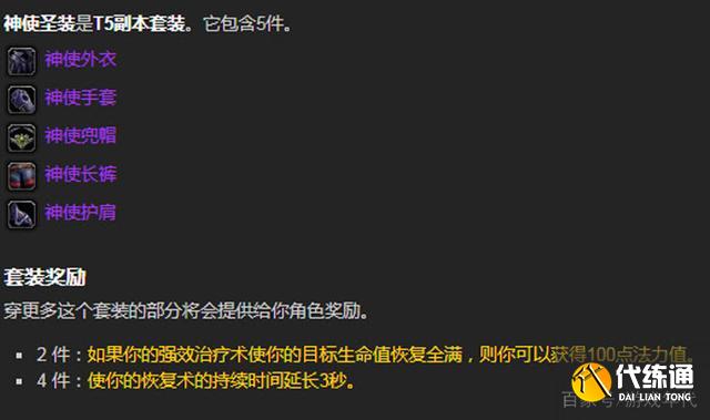 最后就是各种治疗天赋,不是说套装不好,而是治疗没必要花大价钱买套装。治疗散件,从布甲到板甲,4个奶妈各取所需,基本不存在竞争问题,更没有人会无聊去顶治疗的价。你可以说奶妈们都比较排骨,但一身散件带来的加血效果与套装并无多大区别,看看牧师T5的效果吧,过量加血回100蓝,恢复延长3秒,穿散件又有什么问题呢。