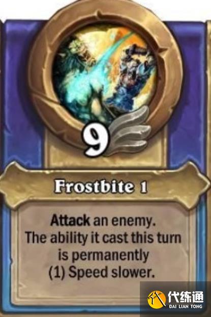 (1级)冰霜,9速,攻击一个敌人,并使其在本回合中使用的技能速度值永久减慢(1)点。