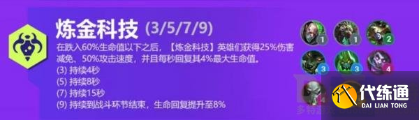 在跌入60%生命值以下之后,【炼金科技】英雄们获得25%伤害减免、50%攻击速度,并且每秒回复其4%最大生命值。