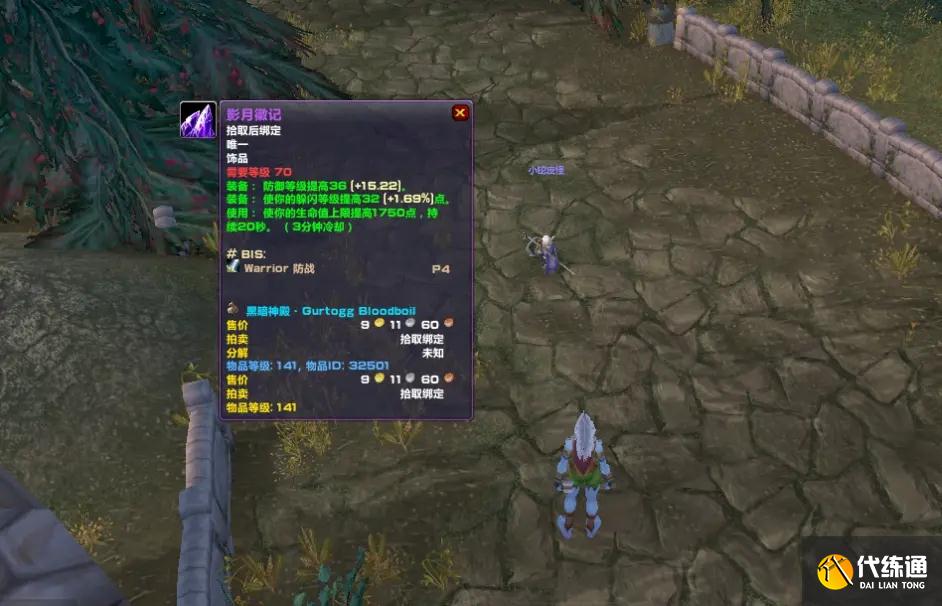 影月徽记是黑暗神殿血沸掉落的一件坦克饰品,常驻属性为36防御等级和32闪避等级,主动特效为提升1750点生命值,持续20秒,CD3分钟。