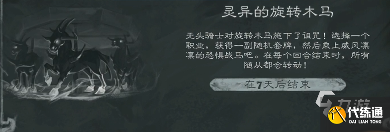 在灵异的旋转木马乱斗里。这个乱斗是不需要玩家进行组牌的,并且这套乱斗使用的套牌是狂野卡池。在游戏开始的时候,双方玩家场上都有两只恐惧战马,需要注意的是,这两只恐惧战马都是改动版本前的。也就是说,在战马死后会立即复活,而不是在回合结束时再次复活。