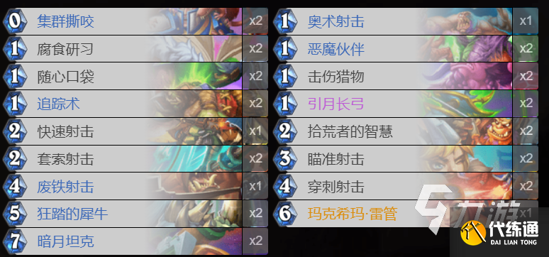 在镭管猎的起手留牌方面,主要是以奥术射击,恶魔伙伴,击伤猎物,集群撕咬,腐食研习,随心口袋,追踪术,快速射击,套索射击,引月长弓,拾荒者的智慧,瞄准射击等低费卡牌为主。