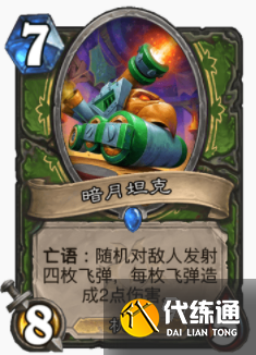 在对阵快攻方面,主要是通过集群撕咬和奥数射击,快速射击这类直伤卡组来进行前期过渡。特别是在引月长弓的加持下,更加可以对快攻进行压制。基本上只要拖到6费后,就可以利用镭管的亡语触发暗月坦克的效果。