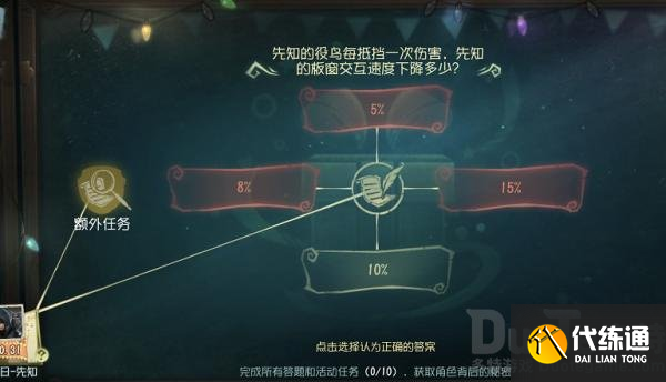1、问题:先知的役鸟每抵挡一次伤害,先知的板窗交互速度下降多少?选项:5%,8%,10%,15%