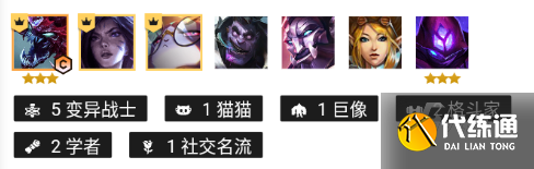 阵容羁绊:五变异战士一猫猫一巨像两格斗家两学者一社交名流。