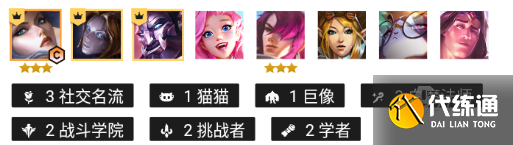 阵容羁绊:三社交名流三白魔法师两战斗学院两挑战者两学者一猫猫一巨像。