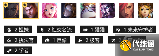 阵容羁绊:两姐妹两社交名流一猫猫一未来守护者两执法官一巨像两极客两白魔法师两学者。