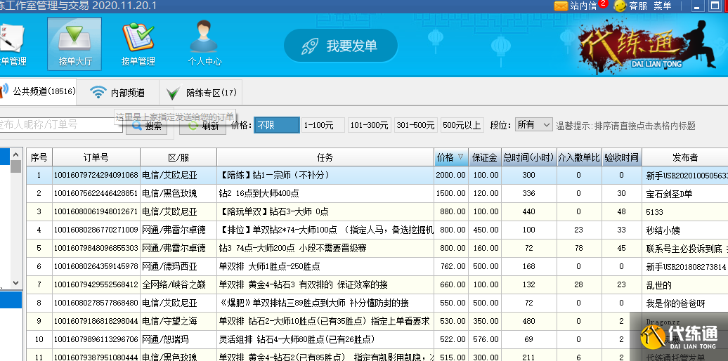 这时候就可以选择去代练通,里面不仅每天都有几千个单,各种段位和价钱都清清楚楚,有实力在代练通注意下规则和接适合自己的单,赚钱都还是非常轻松的,也帮你免去了到处找单的烦恼。