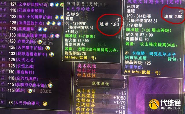 部落阵营这把弓名为“高阶督军的弯弓”,属性一模一样,都是要花13000荣誉点数购买。纵观60和70级的高级远程武器,攻速1.8的只此一家,整个TBC只有黑庙的坦克远程武器“坚韧卫士火枪”攻速1.9。安苏掉落的防御向大火枪,攻速2.0但总体仍不及元帅弓,所以使用下面这种玩法的猎人,现阶段用60级的紫色弓,下阶段换坚韧卫士火枪。