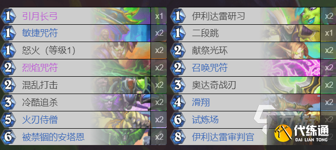 在矿井决斗瞎的起手留牌方面,主要是以引月长弓,伊利达雷研习,二段跳,献祭光环,召唤咒符,敏捷咒符,怒火(等级1),烈焰咒符,混乱打击,等低费卡牌为主。