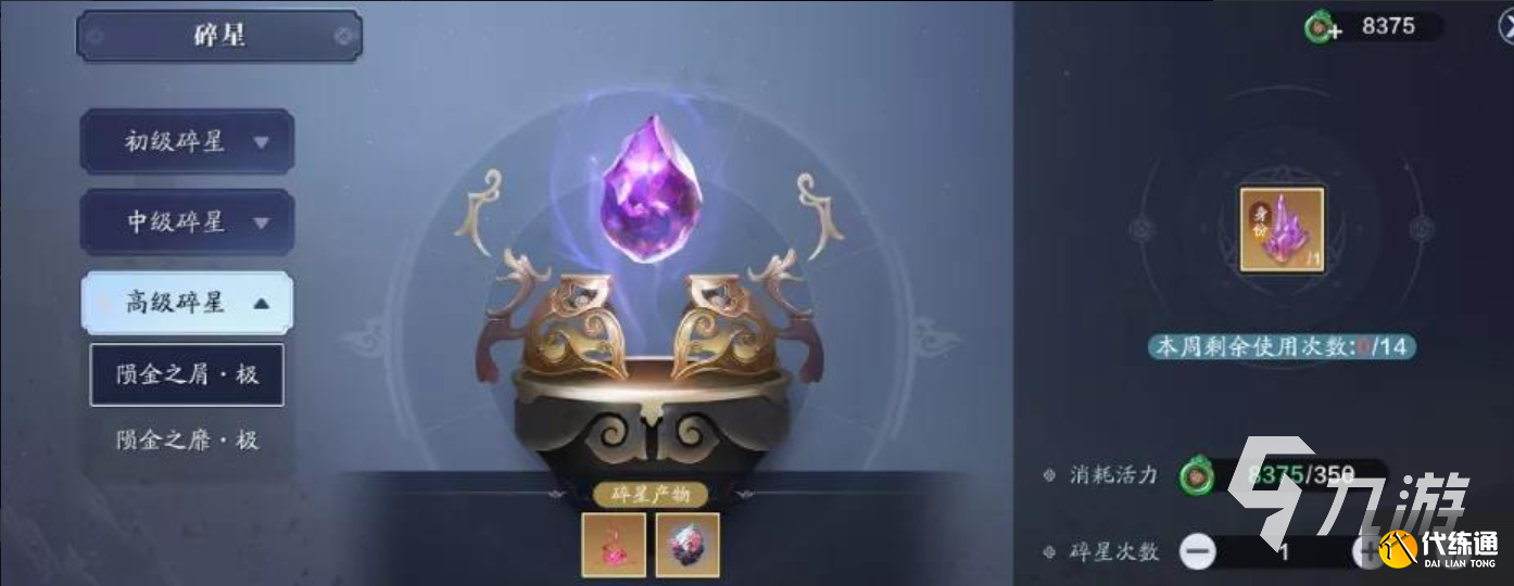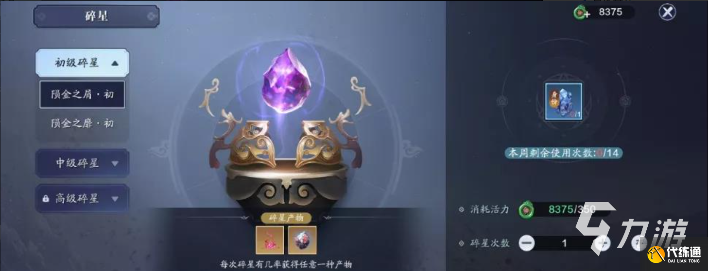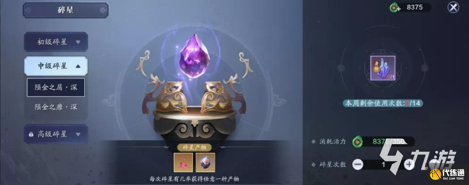 2.在碎星活动中一共有三个碎星等级,分别是初级、中级、高级。每周玩家碎星的次数都是有限制的,最大次数为14次,每次消耗玩家350活力,这里有一个小技巧玩家在第一周的时候帝焰身份就可以升级到八级,然后就可以进行中级碎星了,中级碎星玩家可以获得大量的精工材料和游戏代币。