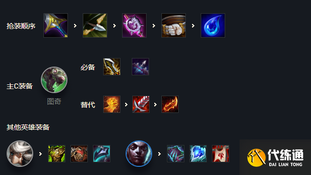 主C图奇:装备给上无尽,正义,轻语备选饮血,羊刀。