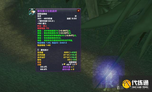 复仇角斗士的战斧的装备等级达到了146,不仅附带大量的暴击和攻强,还有命中属性和破甲属性,而这些属性对于猎人来说都是非常重要的,在使用磨刀石的情况下,属性收益不输凤凰双爪。