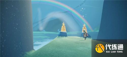 2、之后我们就能在山道的前方看到一个彩虹,直接往彩虹的方向飞行,然后就能看到彩虹的下面有两个石墩子;