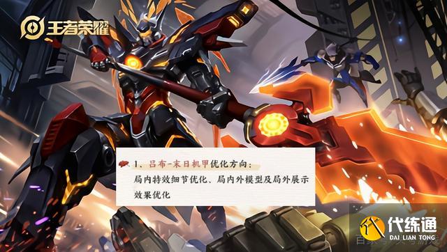 吕布的末日机甲这款皮肤同样是一个史诗皮肤的价格,但是这款皮肤基本上没有任何的特效,空有一个机甲皮肤的模型,所以和皮肤是非常不匹配的,接下来将会对末日机甲整体的品质进行提升,局内的特效细节优化,局内外模型以及局外展示效果都会进行优化,末日机甲虽然是一个史诗,但是拥有动态展示,这一点还是挺不错的,希望优化之后不要取消,末日机甲可以通过使用皮肤碎片兑换,如果大家最近有多余的皮肤碎片也可以提前拿下。