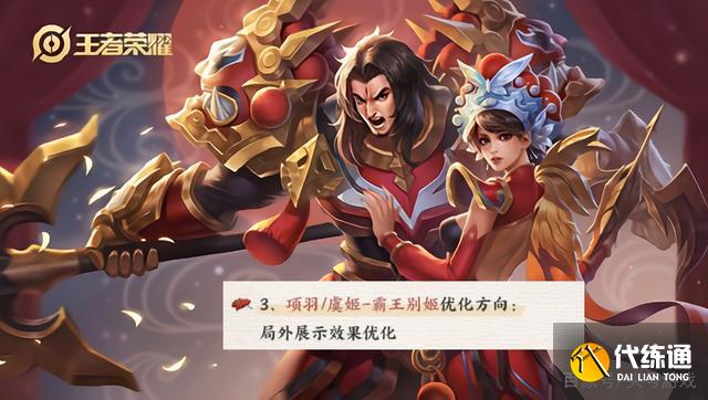 这一次优化公布的名单中还有项羽和虞姬的霸王别姬,霸王别姬这两款皮肤实际上已经经过了一次重做,当时重做之后迎来的特效和手感还是很不错的,但是时隔了两年的时间,官方决定对这款皮肤的局外展示效果进行优化,也就是说只是展示动画和显示界面改动,对于游戏内的特效可能不会改动。优化之后这两款皮肤很有可能会进行返场,所以大家可以期待一下。