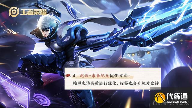 最后一款将会优化的皮肤就是赵云的未来纪元,赵云的皮肤虽然有很多,但是大多数都是一些勇者,而且售价还比较高,按照官方所说,未来纪元这款皮肤将会按照史诗品质进行重做,到时候这款皮肤的标签也会升级为史诗,这样的话赵云就可以迎来属于自己的普通史诗皮肤了,这款皮肤的重做也会和妲己的女仆咖啡以及孙尚香的水果甜心一样,带来全新的特效,所以非常值得拥有。