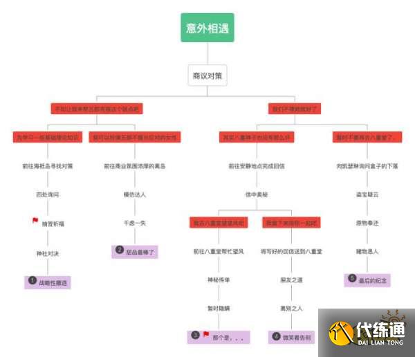 1.关键支线:红色是关键选择项,决定了剧情的走向;紫色是结局,从左到右分别是第1、2、3、4、5个结局;旗子是关键的成就项。