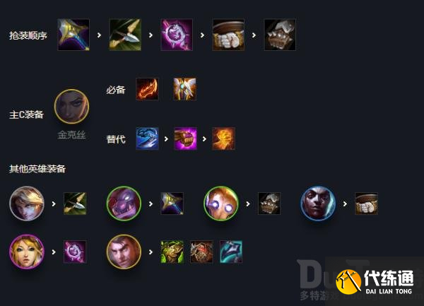 前期的话优先做金克丝的装备,给EZ打工过度,尽可能打连胜升人口。