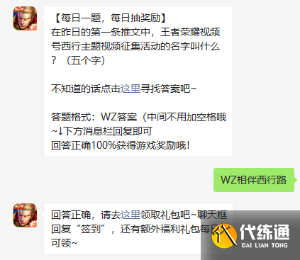 题目:在昨日的第一条推文中,王者荣耀视频号西行主题视频征集活动的名字叫什么?(五个字)