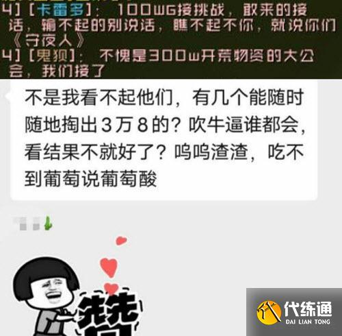 面对敌会的嘲讽,醉酒笑红尘的招人玩家炸毛了,直接在世界频道上对守夜人公会下挑战书!表示赌约100万金,倾全会之力,就为争这一口气。还说敢来的就接话,输不起的就别说话。话音未落,守夜人的老哥也丝毫不怂,直接在下面回复:不愧是有300万开荒屋子的大公会,我们接了!此话可谓一石惊起千层浪,匕首岭吃瓜群众和各路公会纷纷关注,100万金可不是小数目。