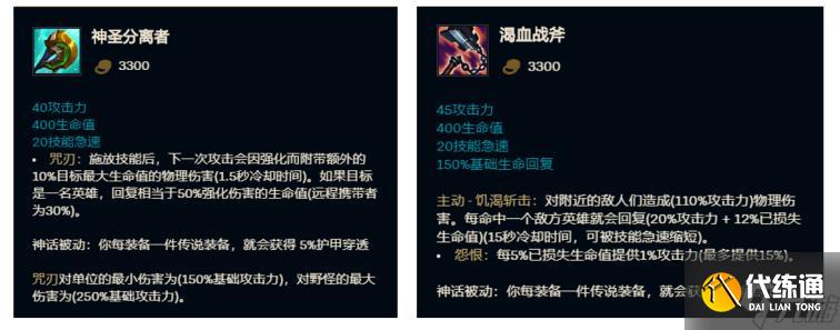 神圣分离者和渴血战斧的价格相同,但是渴血战斧多出了5点攻击力和150%基础生命回复的属性。神圣分离者能增加厄加特的护甲穿透,但是被动技能咒刃需要平A触发,这样厄加特在战斗中不得不关掉W,A后重新开启,这样容易损失锁定目标。