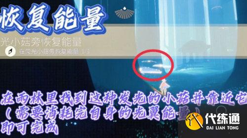 2.任务二:前往雨林地图,可以在树林间找到下图所示这种发光蘑菇,将翅膀能量耗尽,然后站在上面充能。