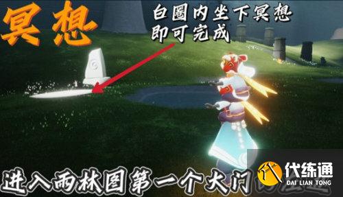 4.任务四:前往雨林的第一个大门,然后在左边不远处(下图所示)能够看见有打坐用的白圈,进去冥想即可。