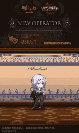 因为是【傀影与猩红孤钻】的奖励干员,所以立绘的背景为深邃幽深的黑棕交错,躯体也被衣物的颜色非常清晰的分成了两个部分,白色的头发和衬衫非常的瞩目,一点点的紫色又不会显得太过于死板,脸部刻画得相当暖男。