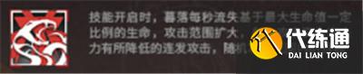 二技能会让暮落流失一定比例的生命值,带来的增益为扩大攻击范围且攻击变为攻击力有所降低的连发攻击,但攻击目标并不是群体攻击而是随机攻击