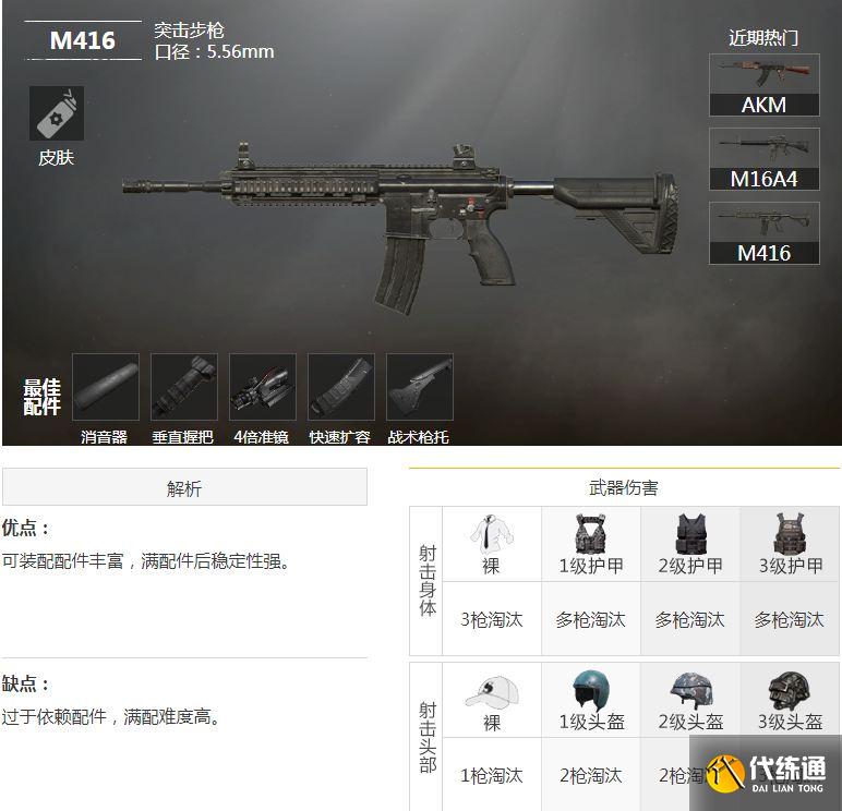 虽然M416的伤害经历过几次调整,但相比于AKM它的稳定性依然很强,在满配情况下更是毫无后坐力,补偿、轻型握把、快扩和枪托的获取难度不高,所以很多新手玩家和压枪技术一般的玩家都会选择这件武器,无论是红点还是6倍M416都非常的好用,不过它的伤害偏低,所以这也是玩家在AKM和M416直接犹豫不决的原因之一。
