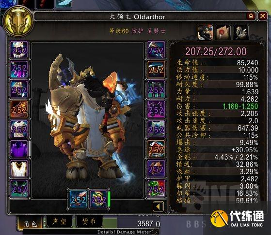 注:PTR目前大秘境装等光环为252。配装里带的8.3橙披进本后只比同样装等的装备高6点副属性绿字,特效都是被禁用了的,这只是我用来调整装备光环下最优绿字比例用的配装。