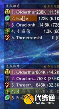 翅膀结束瞬间的输出和治疗统计如下,9目标打满一套爆发20秒内我打了10个盾击,884K的总输出量,秒伤44.2K,奶了11.5K HPS(基本都是飞盾吸收盾的治疗量)。