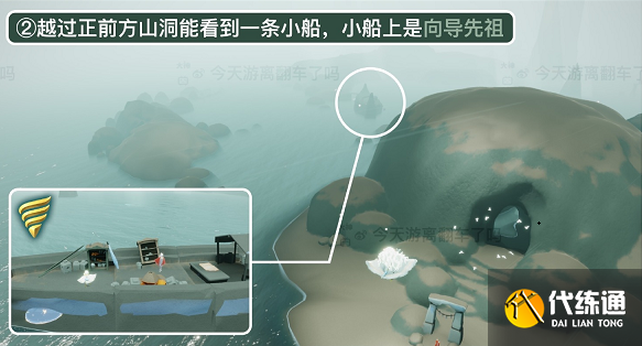 2、越过正前方山洞能看到一条小船,小船上是向导先祖。
