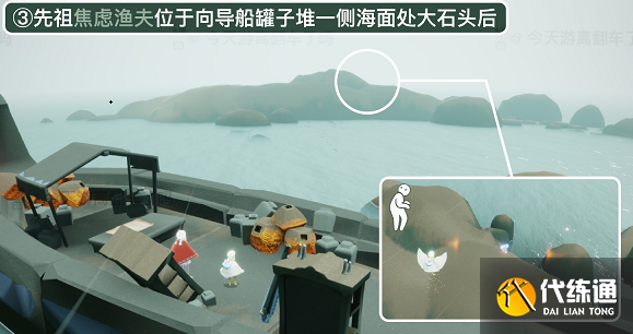 3、先祖焦虑渔夫位于向导船罐子堆一侧海面处大石头后。