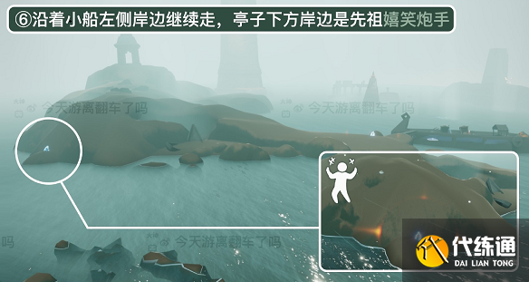 6、沿着小船左侧岸边继续走,亭子下方岸边是先祖嬉笑炮手。