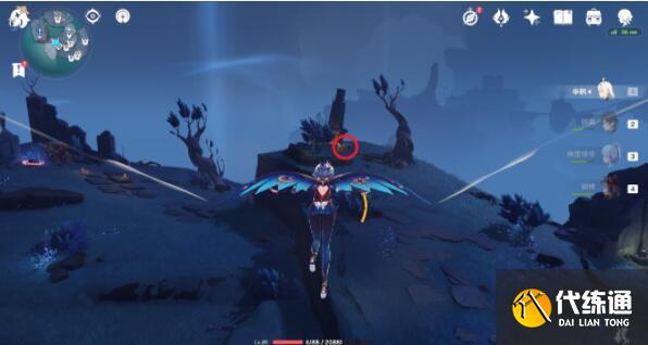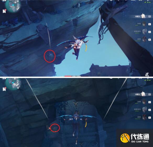 标点1:这里比较隐秘,传送至常夜灵庙下方传送点,向左侧峡谷飞去,看见下图中的吊钟时下落,标点1在悬崖内的密室里