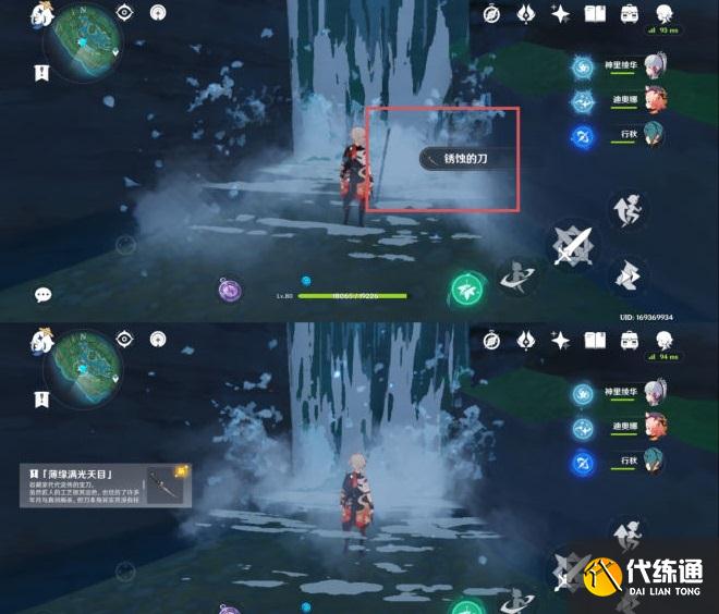 此处有个瀑布,下面有一把锈蚀的刀,刀名叫【薄缘满光天目】