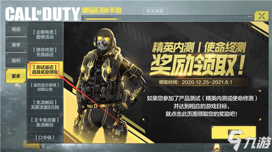 2、点击进入活动内,找到更多字样,点击进入另外一个页面,即可看到测试返还道具奖励领取的版块了。